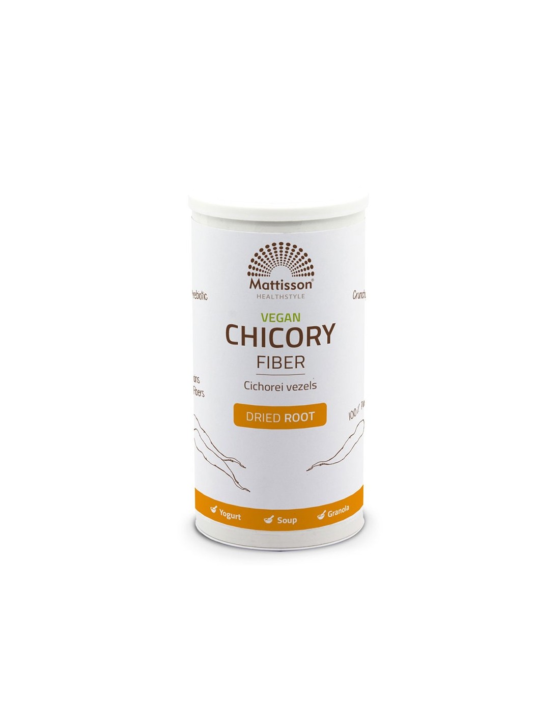 Цикория (Cichorium intybus) е многогодишно растение от семейство Asteraceae, използвано от векове като естествено средство за добро здраве. Познато още под името „синя жлъчка“, то представлява двугодишно растение, което през първата година образува корен с голям енергиен резерв (инулин), а през втората протича разлистването на характерните синьо-лилави цветчета. Коренът от цикория съдържа 85% пребиотични растителни фибри, част от които полизахариди – инулин (фруктан) и пектин. Vegan Chicory fiber dried root Mattisson съдържа около 70% инулин и 9% пектин и е подходящ за добавяне към салати, кисело мляко, мюсли, сосове, супи и др.