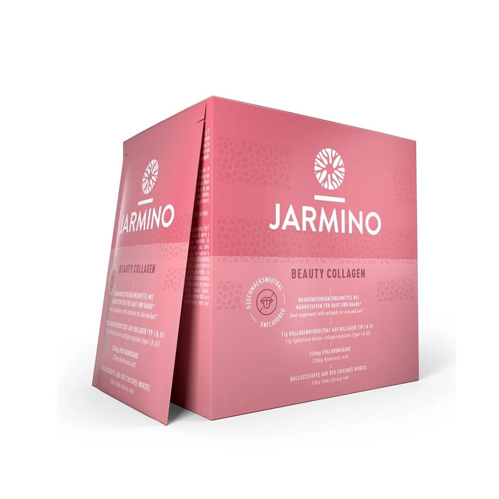 Beauty Collagen Sachets Jarmino е ежедневен еликсир с неутрален вкус и отлична разтворимост, който помага за поддържане на колагеновите нива в организма. Благодарение на практичната форма на сашета, продуктът е лесен за дозиране и употреба дори по време на пътуване или на работното място. Многофункционалната му формула е подходяща за комбиниране с вода, кафе и чай или в ролята на питателна добавка към супи, сосове, смутита, шейкове, кисело мляко и мюсли. Съдържа комплекс от специално подбрани активни съставки, насочени към подобряване на здравето и външния вид на кожата, косата и ноктите.