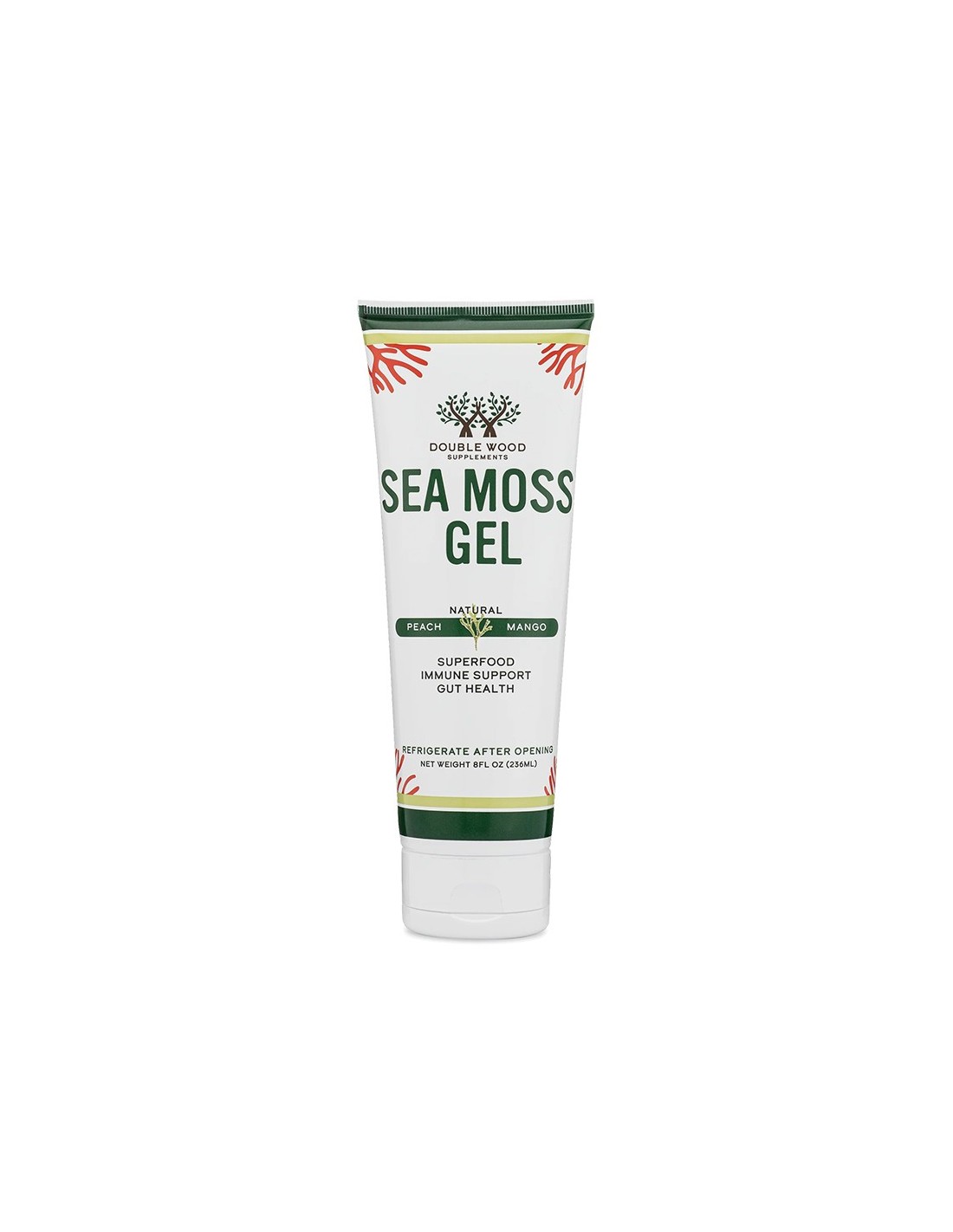 Irish Sea Moss Gel, на американската компания Double Wood, е с приятен вкус на праскова / манго и има само 1 грам добавена захар на порция, което го прави здравословна и вкусна суперхрана.