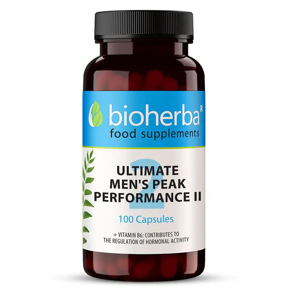 Ultimate Men’s Peak Performance II на Bioherba е специално разработена хранителна добавка, съчетаваща билкови екстракти, аминокиселини и витамини, насочена към подобряване на мъжкото здраве и сексуалната функция. Формулата включва екстракти от бабини зъби (Tribulus terrestris), Тонгкат Али (Eurycoma longifolia) и овес (Avena sativa), които подпомагат хормоналния баланс, повишават либидото и подобряват тонуса. Аминокиселините L-аргинин и L-цитрулин стимулират кръвообращението и подпомагат ерекцията, като същевременно увеличават енергията и издръжливостта. Витамин B6 допринася за нормалната функция на нервната система и метаболизма на енергията.