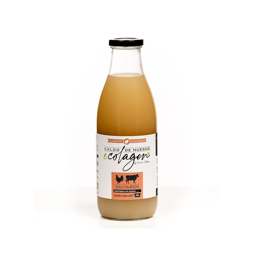 Caldo de Huesos Solo Huesos Collagen Ecolagen е висококачествен бульон от пилешки и телешки кости от свободно пасящи животни. Костният бульон осигурява колаген, аминокиселини, хондроитин, глюкозамин, минерали и витамини от група B, които поддържат нормалното функциониране на организма. Ценните компоненти осигуряват подкрепа на имунната система и помагат за намаляване на възпалителните процеси. Също така стимулират синтеза на колаген, който насърчава храносмилането и здравето на костите, кожата, ноктите и косата.