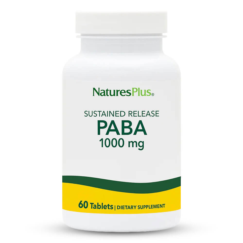 ПАБА (PABA) Парааминобензоена Киселина 1000 mg на NaturesPlus® е висококачествена хранителна добавка, създадена да подпомага красотата и здравето отвътре навън. Тя съдържа Пара-аминобензоена киселина (известна още като Витамин B10). Тя играе ключова роля в метаболизма на белтъчините и тяхното ефективно разграждане до аминокиселини. Това ценно съединение е основен градивен елемент за образуването на Фолиева киселина и съдейства за усвояването на Витамин B5. Благодарение на своите антиоксидантни свойства, ПАБА предпазва кожата от вредното въздействие на UV лъчите и забавя процесите на стареене. Наричана „витаминът на красотата“, тя помага за запазване здравия вид на кожата и косата, като се бори с преждевременното побеляване и косопада.