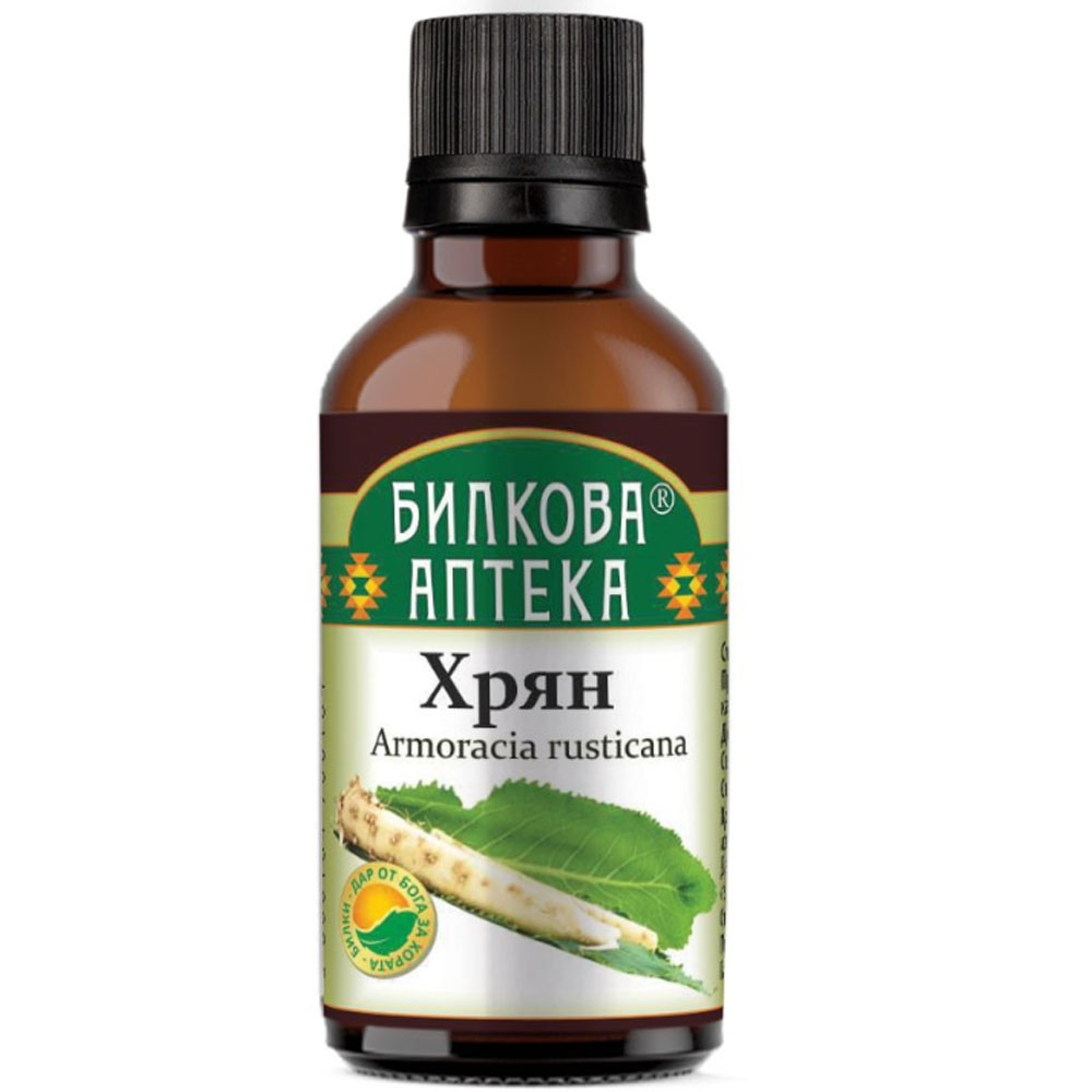 Тинктура Хрян е натурален продукт, който подпомага здравето на дихателната, храносмилателната и имунната система. Екстрактът от корен на хрян е богат на синапено масло, витамини и минерали, които имат мощни противовъзпалителни, антимикробни и антиоксидантни свойства. Продуктът стимулира дихателните пътища, като облекчава запушен нос, кашлица и симптоми на синузит. Освен това тинктурата подпомага храносмилането, като стимулира производството на стомашни сокове и облекчава подуването и тежестта след хранене. Тя също така насърчава изчистването на токсини от организма, като стимулира метаболизма и поддържа функциите на черния дроб. Благодарение на антимикробните си свойства, тинктурата е полезна при сезонни настинки и за укрепване на имунната система. Лесна за употреба, тя е изцяло натурална и не съдържа изкуствени добавки или консерванти. Идеална е за хора, които искат да поддържат енергията и здравето си по естествен начин.