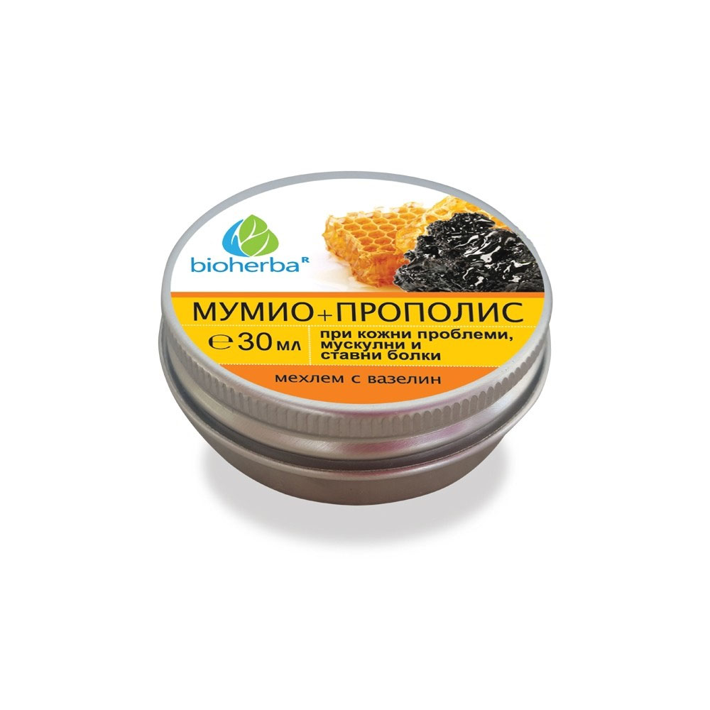 Мехлем при кожни проблеми с мумио и прополис – Комбинацията от мумийо и прополис оказва благоприятно действие при кожни проблеми и възпаления, рани, болки в мускулите, ставите и костите, отоци, хемороиди, разширени вени, изгаряния, гнойни рани. Добавените вазелин, ланолин и витамин Е допълнително омекотяват и успокояват кожата, а етеричното масло придава естествен хвойнов аромат.