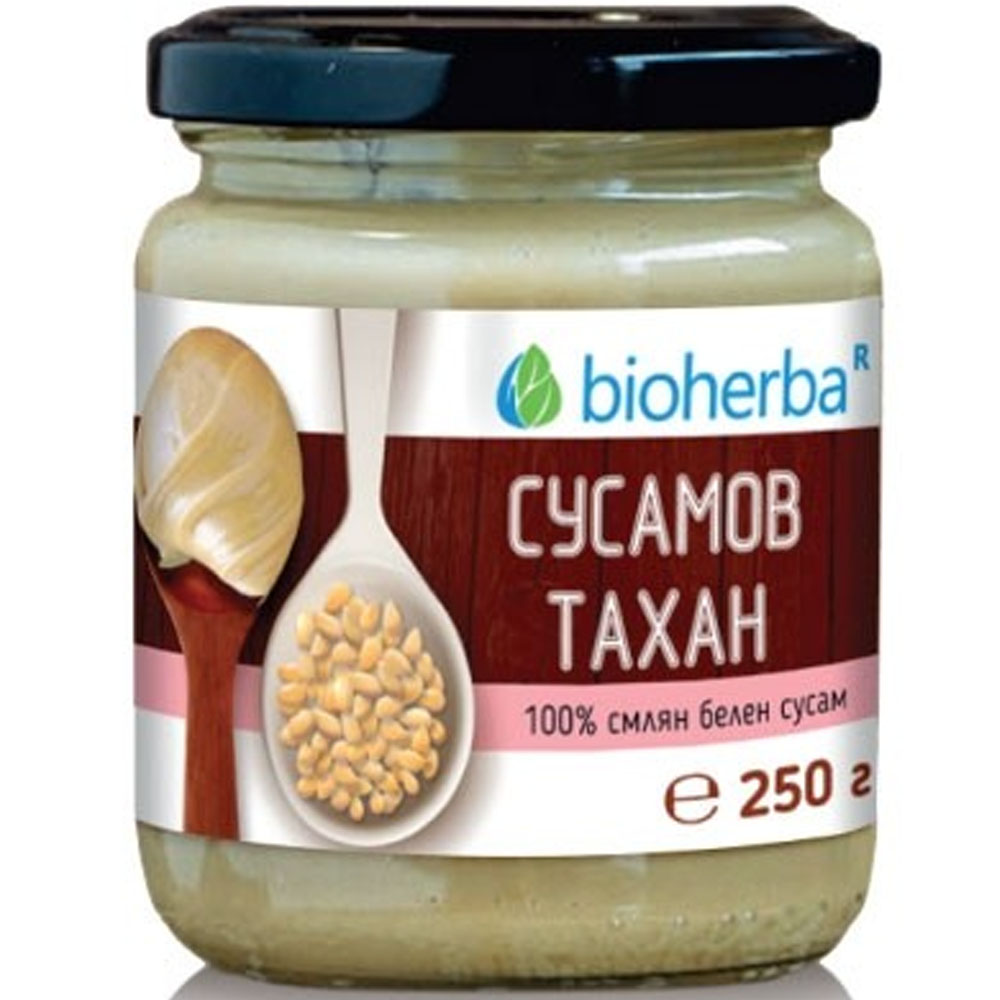 Сусамовият тахан на Биохерба е натурален продукт, произведен изцяло от смлени сусамови семена. Сусамът има изключително богато съдържание на ценни хранителни вещества – калций, магнезий, желязо, селен, цинк, фосфор, лецитин, метионин. Освен това, той е богат на фитонутриенти, вит. Е и витамини от В-групата и най-вече на тиамин. Доказано е, че четвърт чаша сусам на ден (35 гр.) ни осигурява около: 75% от препоръчителната дневна доза мед, действа противовъзпалително и болкоуспокояващо. Влияе добре на артритните заболявания. Помага при астма. Имуностимулатор.